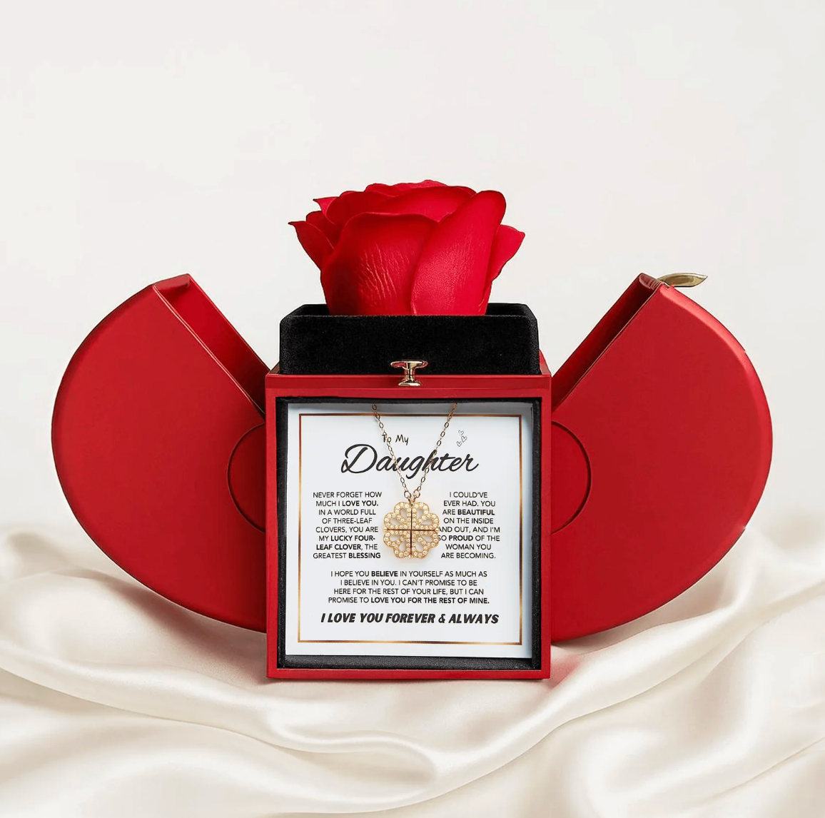 This gift set, featuring a 4-leaf clover necklace, Forever Rose Gift Box and a heartfelt message card, is a powerful token of your bond.